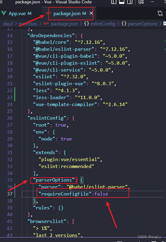 需要在package.json文件中的"parserOptions"节点下增加如下代码"requireConfigFile":false