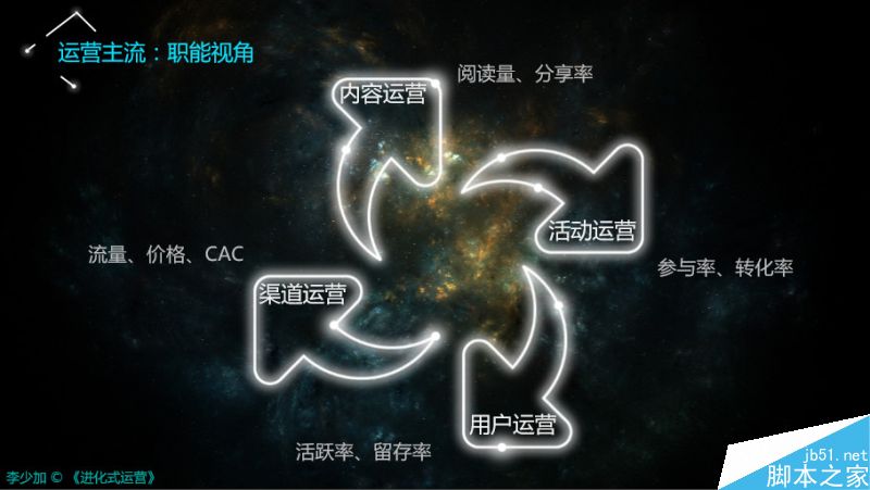 洞察真相的视角。对于“写作”这个行为,不同身份的人采取不同策略去应对,对学生来说是写作是教育和考试,对于商人是为了迎合市场需求。由此可见同一个事物会产生不同视角。那么对于互联网运营,应该从哪些视角来看待?目前的视角是主流的视角,这个视角非常简单易懂,边界清晰,非常好安排工作,但是未必是最合适的。这四个职能各自关注的指标都是散的,内容运营关注阅读量和分享率,渠道关注流量、价格、CAC,各自都是散的,但是肯定都有优化的空间。最牛的将军,他们不是说自己很善于打仗,而是在庞杂的军事体系当中找到一个统一的点,进而驾驭千军万马。对互联网运营也是一个道理,如果我们渴望将不同岗位的能力汇聚在一起,最终产生1+1>11的效果,那必需要找到一个统一视角。这个统一视角在哪儿?