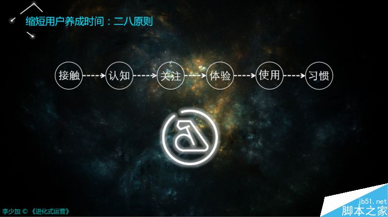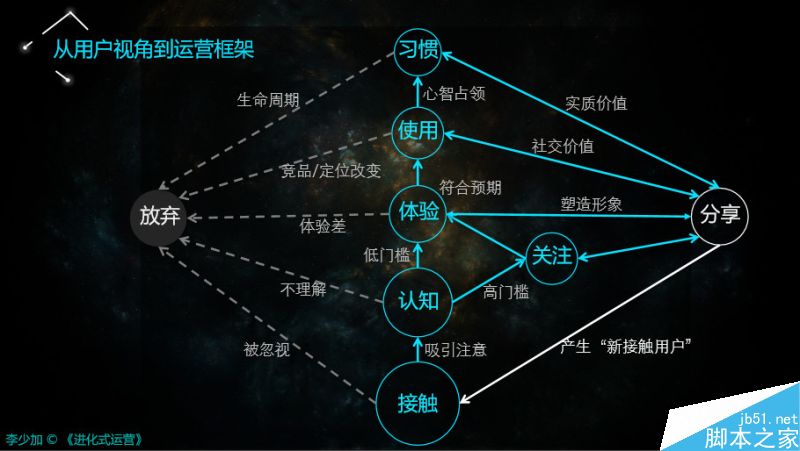 首先运营不是简单一下就把潜在用户变成一个习惯用户的过程。恰恰相反,运营是循序渐进、环环相扣而使潜在用户转化成习惯用户的一个漫长过程,而且这个过程当中,这些用户还会不断的影响他生活轨迹中的其他用户。这一系列的认知非常重要,从用户视角来看,所有人从接触、认知、关注、体验、习惯,所有的过程都是一致的、统一的、稳定的。