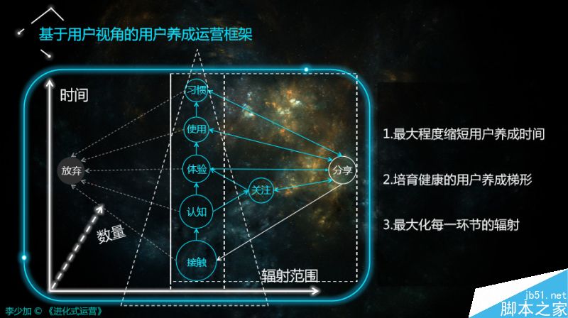 以时间作为纵向坐标轴,以辐射的范围作为横向坐标轴,以数量作为水平坐标轴,套上一个框架。这个框架就是用户养成运营框架,由此可以推出运营工作的实质,也是做任何运营的一个策略动机和出发点。