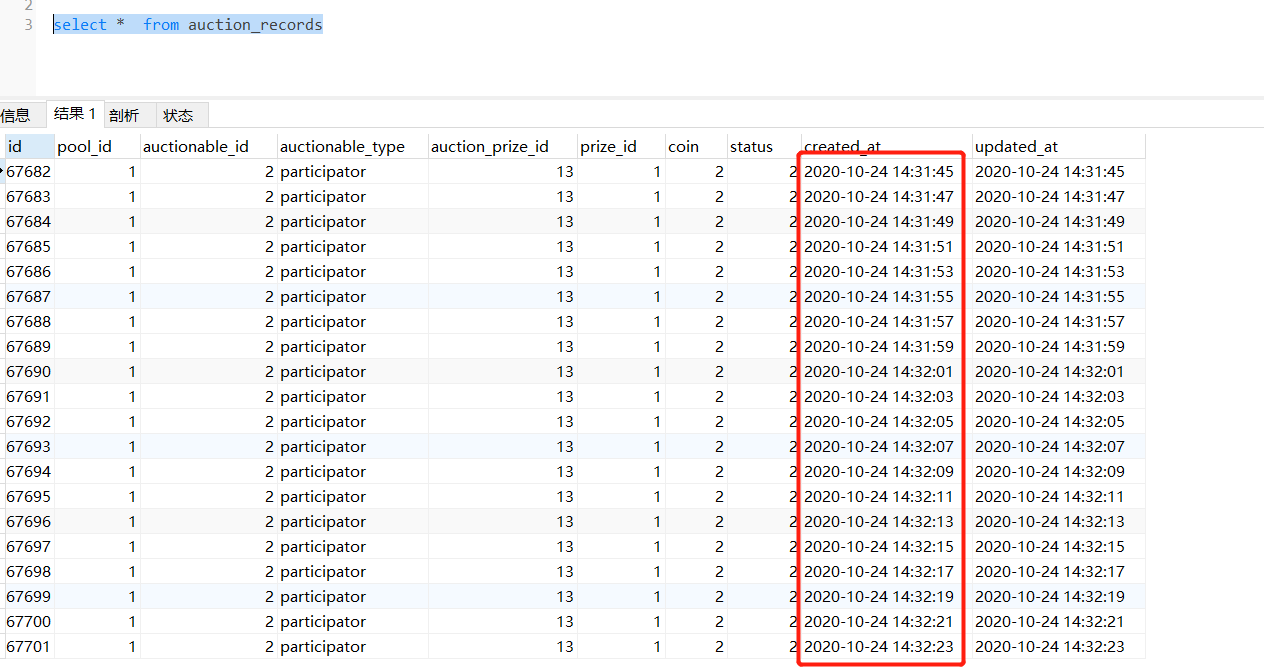 需求:批量插入上万条数据,要求created_at(创建时间)为依次递增的数据,其他字段不做限制