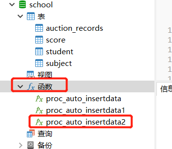 创建成功之后,在库的函数下进行刷新,则可以看到新建的存储过程:
