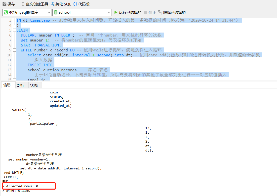 | CREATE PROCEDURE `proc_auto_insertdata2`( IN record INTEGER, -- record参数用来传需要插入数据的条数 IN dt timestamp -- dt参数用来传入时间戳,开始插入的第一条数据的时间(格式为:'2020-10-24 14:31:44') ) BEGIN DECLARE number INTEGER ; -- 声明一个number,用来控制循环的次数 set number=1; -- 将number的值赋值为1,代表循环从1开始 START TRANSACTION; WHILE number <=record DO -- 使用while进行循环,满足条件进入循环 select date_add(dt, interval 1 second) into dt;-- 使用date_add()函数将时间进行转换为秒数,并赋值给dt参数 -- 插入数据 INSERT INTO school.auction_records -- 库名.表名 -- 由于id是自动增长,不需要额外赋值,所以需要将剩余的其他字段全部列出进行一一对应赋值插入 (pool_id, auctionable_id, auctionable_type, auction_prize_id, prize_id, coin, status, created_at, updated_at) VALUES( 1, 2, 'participator', 13, 1, 2, 2, dt, dt); -- number参数进行自增 set number =number+1; -- dt参数进行自增 set dt = date_add(dt, interval 1 second); end WHILE; COMMIT; END |
