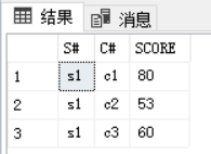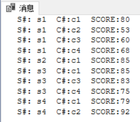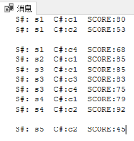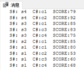上面的实验代码为使用游标语句检索SC表中的S#,C#,SCORE三个属性的数据。结果如下图: