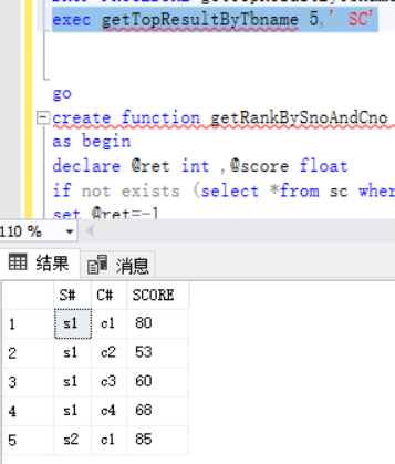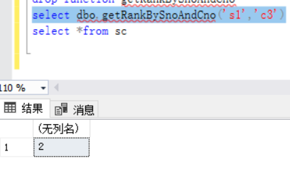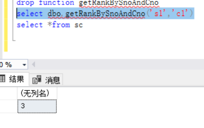select dbo.getRankBySnoAndCno('s1','c1') --对SC表中的s1,c1进行检索