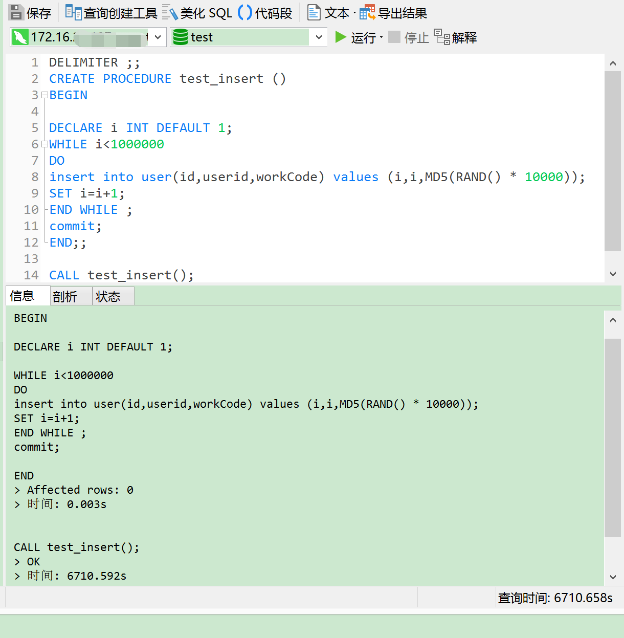2、先写一个存储过程,然后调用存储过程执行插入: