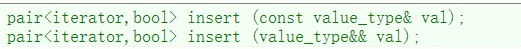 在set中插入元素x,实际插入<x, x>构成的键值对,插入成功返回<该元素在set中的位置,true>,失败则说明x在set中存在,返回<x在set中的位置,false>;