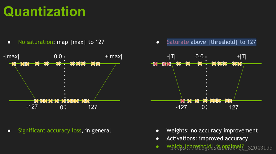 不饱和我们可以将它全部映射到int8的精度上,但是过饱和时就需要设置阈值(saturate)