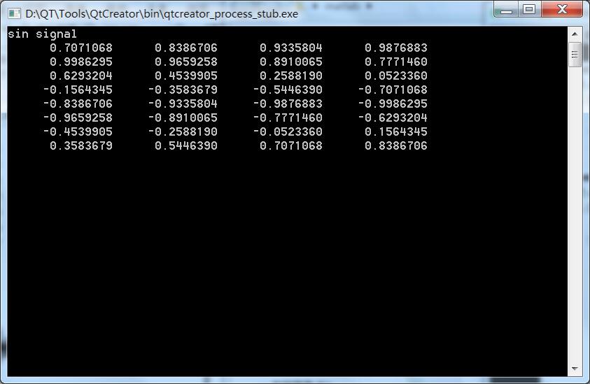 #include <QCoreApplication> #include <math.h> #include <stdio.h> #include <stdlib.h> #include <sinwn.c> int main(int argc, char *argv[]) { QCoreApplication a(argc, argv); int i,m,n; long seed; double fs,snr,x[200]; static double b[3]={1,1,1}; static double f[3]={10,17,50}; static double ph[3]={45,10,88}; FILE *fp; m=3; n=200; seed=13579; fs=150; snr=10.0; sinwn(b,f,ph,m,fs,snr,seed,x,n); printf("sin signaln"); for(i=0;i<32;i++) { printf(" %10.7lf",x[i]); if(i%4==3)printf("n"); } fp=fopen("F:\qt\untitled3\Sinwn1.txt","w"); for(i=0;i<n;i++) { fprintf(fp,"%3d %12.7lfn",i,x[i]); } fclose(fp); return a.exec(); }