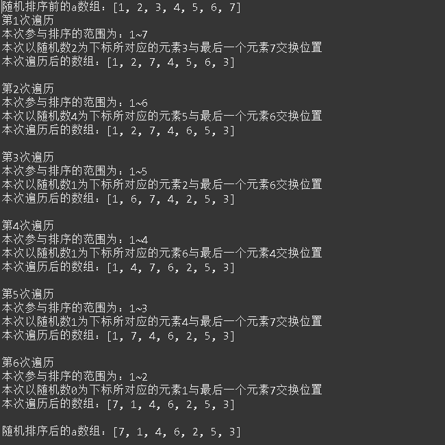 import java.util.Arrays; public class RandomTest { public static void main(String[] args) { int[] a = {1,2,3,4,5,6,7}; System.out.println("随机排序前的a数组:"+Arrays.toString(a)); //当只剩最后一个元素时,是与本身交换,故只遍历length-1次 for (int i = 0; i < a.length-1; i++) { // System.out.println("第"+(i+1)+"次遍历"); // System.out.println("本次参与排序的范围为:1~"+(a.length-i)); //随机得到一个下标,每次下标获取的范围随着遍历减一 int random = (int)(Math.random()*(a.length-i)); //将下标对应的元素与范围最大值对应元素交换位置 //(第一次范围最大值为第10,第二次范围最大值为第9……) // System.out.println("本次以随机数"+random+"为下标所对应的元素"+a[random]+"与最后一个元素"+a[a.length-1-i]+"交换位置"); int last = a[a.length-1-i]; a[a.length-1-i] = a[random]; a[random] = last; // System.out.println("本次遍历后的数组:"+Arrays.toString(a)); // System.out.println(); } System.out.println("随机排序后的a数组:"+Arrays.toString(a)); } }