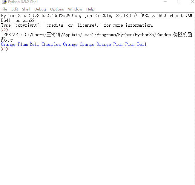 #游戏机有一个投币口,还有一个杠杆。当投币并拉动杠杆后,三个包含不同图片的轮盘开始转动,最后停在三幅图片上。图片有樱桃,橙子,李子,柠檬,横条,以及铃铛这几幅。三幅特定组合的图片会使玩家获得一定的收益。假设每个轮盘包含5个樱桃,5个橙子,5个李子,3个铃铛和一个横条。下面的程序模拟了拉杆拉动以后的情况。每个轮盘包含20幅图片,因此我们随机从1-20中选取数字。