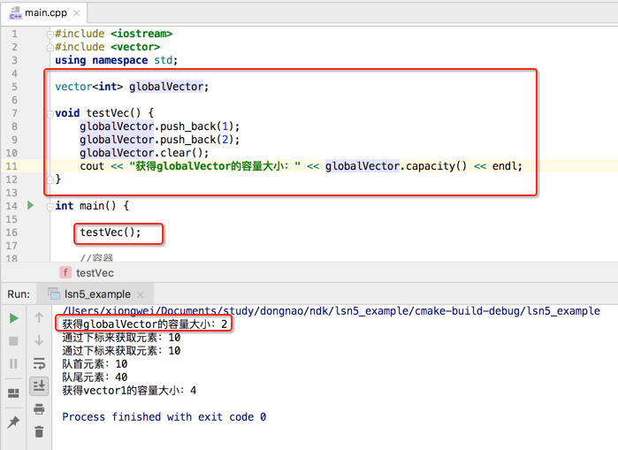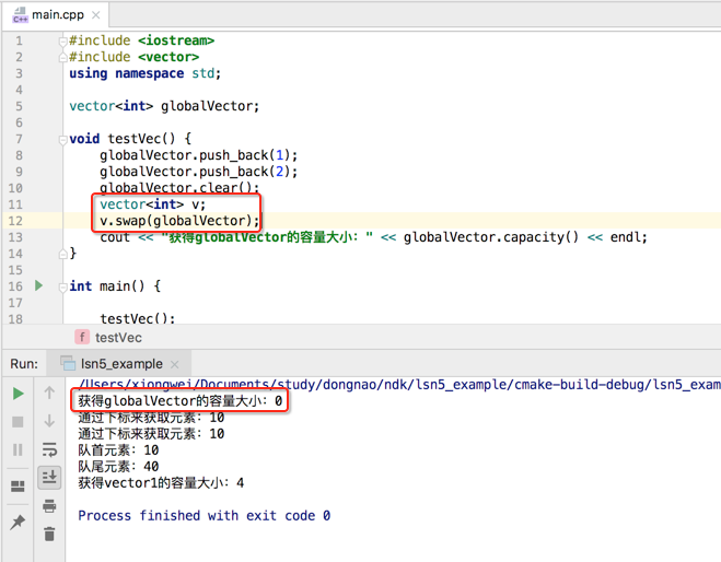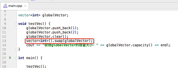 此时全局的容量大小虽说在方法内部被clear()掉了,但大小还是2,那实际如果被调多次那容量不会很可怕,那怎么能达到缩小容量大小的效果呢?这里可以采用swap替换操作,用一个新的临时vector来替换目前的vector,具体做法如下: