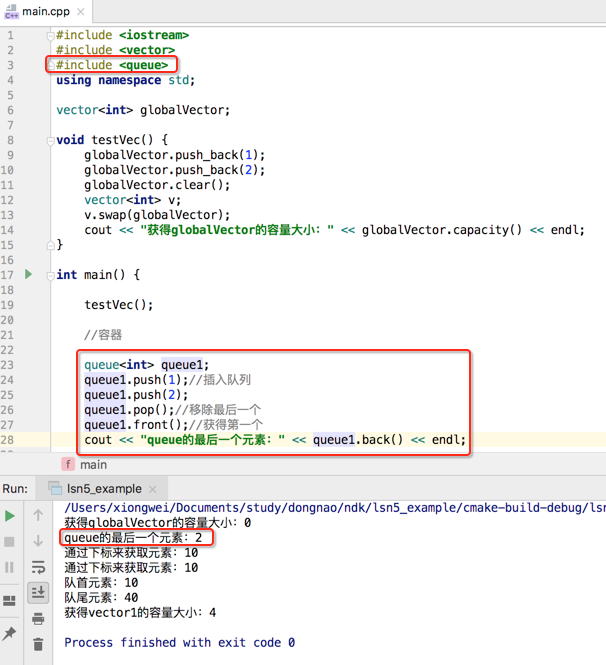 其操作跟vector基本类似,略过。 - 队列(queue):先进先出的值的排列。