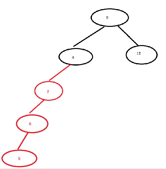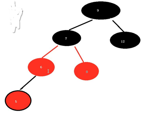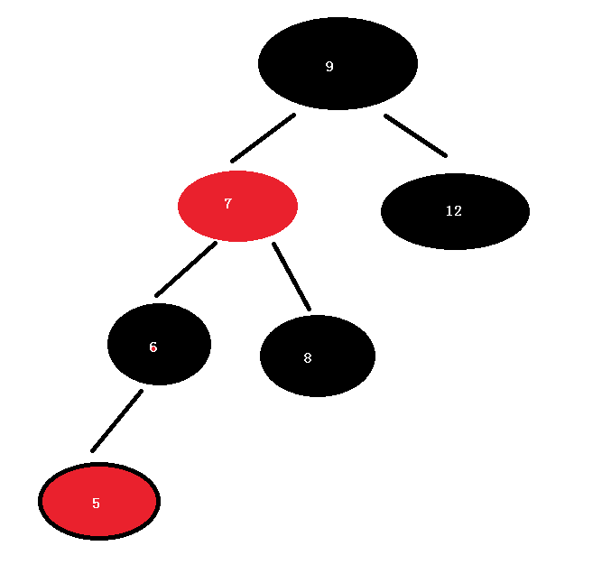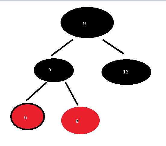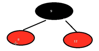 此时又破坏了第5条规则:“5.从任一节点到其每个叶子的所有路径都包含相同数目的黑色节点。”,因为“9”->"8"都是黑色,而"9"->"12"不全是黑色,也就是两边不统一了,为了解决此破坏,就得将“12”也涂成黑色: