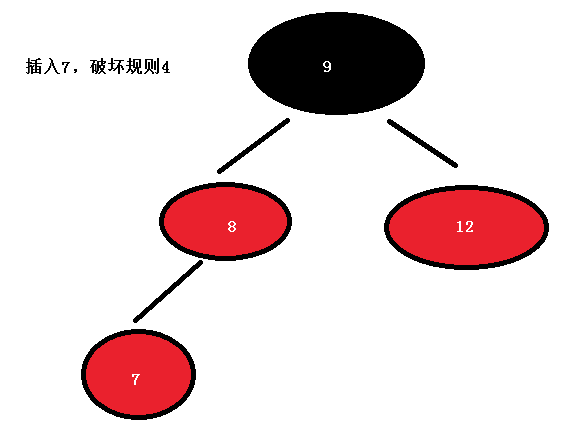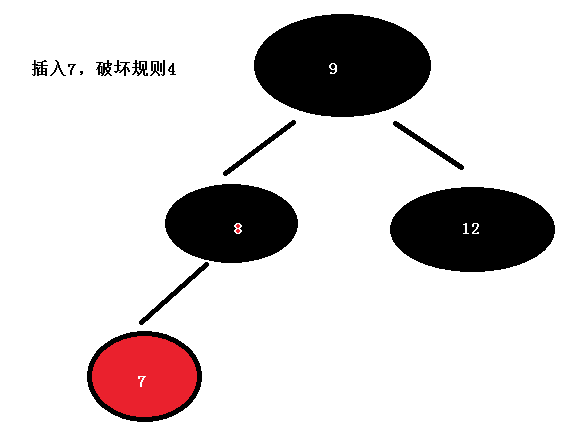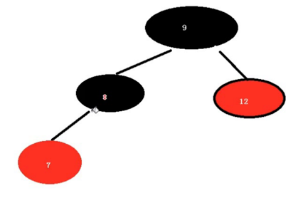 因为规则四是这样描述的:“4 每个红色节点的两个子节点都是黑色。(从每个叶子到根的所有路径上不能有两个连续的红色节点)”,也就是目前“7”、“8”两个都是红色破坏了规则,那么需要根据不同的状况进行不同的策略使其平衡并符合规则,7的父节点8 与叔父节点 12 都是红色,则我们可以将8、12两个重绘为黑色并重绘祖父节点9为红色,所以此时先将“8”涂成黑色: