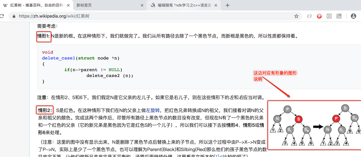 【提示】:关于红黑树什么时候要右旋,什么时候要左旋等一些处理,可以参考维基百科,里面列出了详细的各种情形处理,对着进行处理就成了,如下: