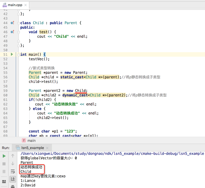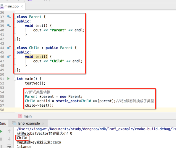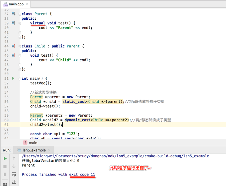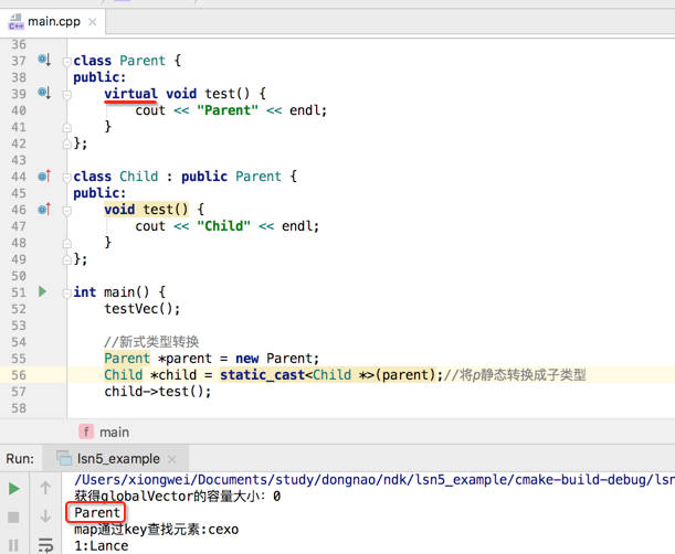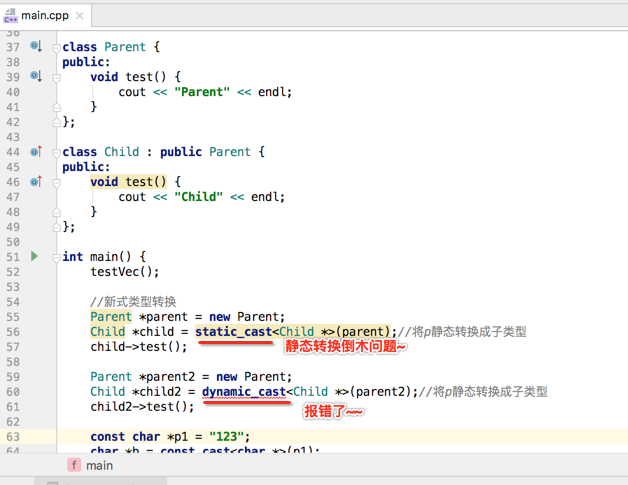 还是拿static_cast的程序进行举例,咱们先将父类的虚函数去掉再做实现:
