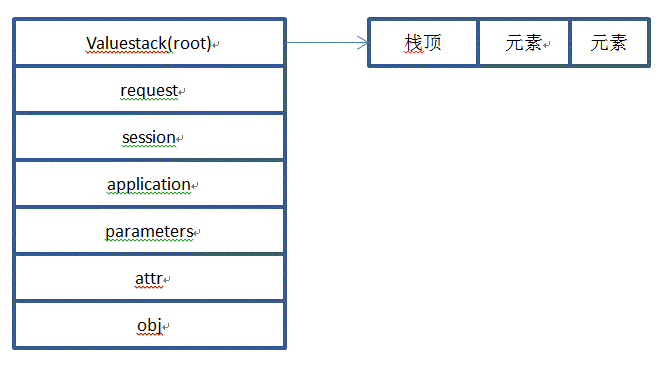 valuestack是OGNL上下文的根元素,此元素只是一个根对象,指向一个队列,队列的第一个元素叫做栈顶;