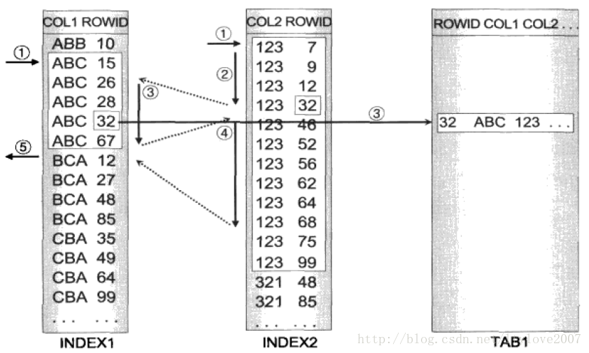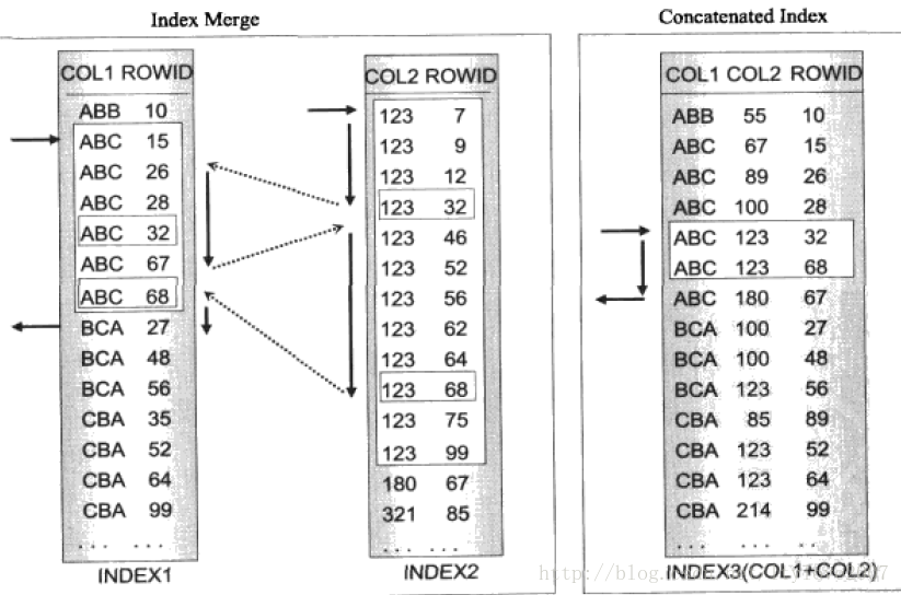 如下图所示,单独的2个索引进行查找——索引合并,需要反复在2个索引表间进行跳转,这是造成速度慢的第一个影响。第2个影响是,假设满足COL1=’ABC’的数据有5行,满足COL2=123的数据有1000行。最坏的情况下(那5行在COL2的1000行最后面)需要扫描完COL2的1000行才能找到需要的数据,并不能达到快速查找的目的。