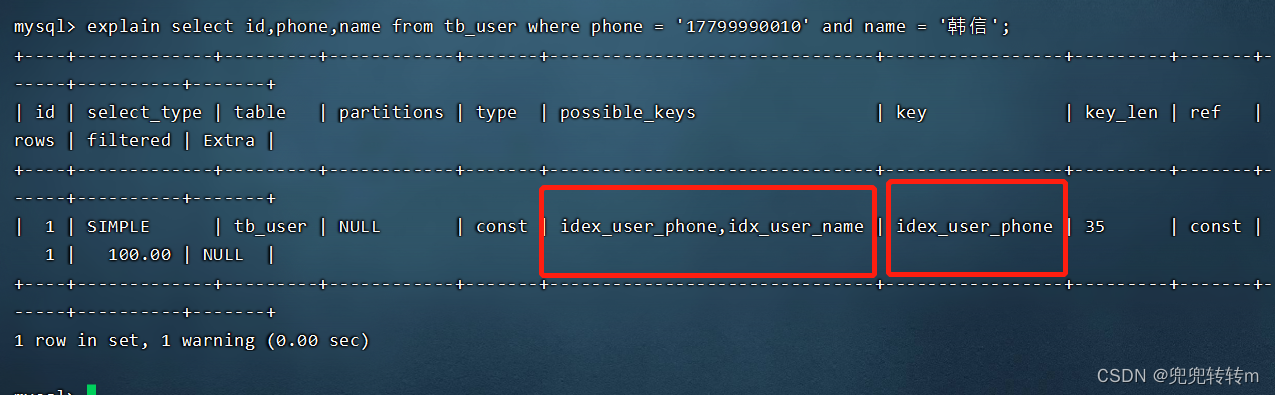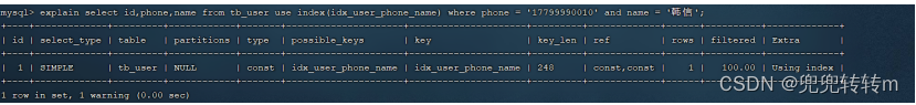 explain select id,phone,name from tb_user where phone = '17799990010' and name = '韩信';