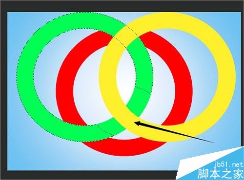 (5)然后确认此时的图层是否在黄色圆环所在的图层,然后按delete键即可获得黄色与绿色圆环的相扣的效果。