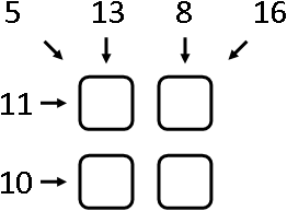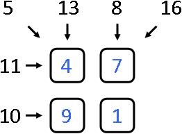 The box's lock looks as follows: it contains 4 identical deepenings for gems as a 2 × 2 square, and some integer numbers are written at the lock's edge near the deepenings. The example of a lock is given on the picture below.