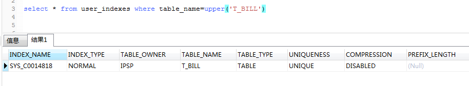 SELECT * FROM user_indexes WHERE TABLE_NAME=upper('T_BILL')