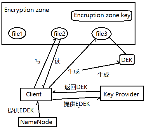 3.DEK不会被HDFS直接处理,HDFS只处理经过加密的DEK,叫做encrypted data encryption key,缩写EDEK。