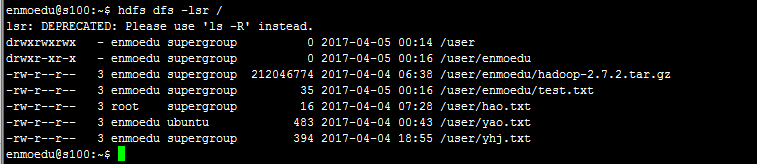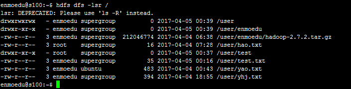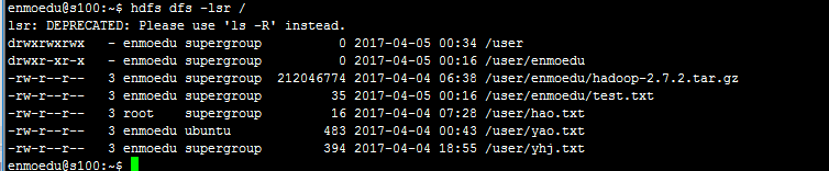 /** * 列出目录下的文件或目录名称示例 */ @Test public void listFiles(){ String urls[]={"hdfs://s100:8020/user/","hdfs://s100:8020/user/test.txt"}; Configuration configuration=new Configuration(); try { //通过给定的URI方案和权限来确定要使用的文件系统 fs=FileSystem.get(URI.create(urls[1]), configuration); //FileStatus类中封装了文件系统中文件和目录的元数据,包括文件的长度、块大小、复本、所有者、及权限信息 FileStatus file=fs.getFileStatus(new Path(urls[1])); //文件大小 long lenthg=file.getLen(); //块大小 long size=file.getBlockSize(); //最近修改时间 long time=file.getModificationTime(); //复本数 int n=file.getReplication(); //所有者 String owner=file.getOwner(); //权限信息 String chmod=file.getPermission().toString(); System.out.println("user目录下的方件有"); System.out.println("===================================="); //调用FileSystem中的listStatus()方法返回一个FileStatus[]数组 FileStatus[] listFiles=fs.listStatus(new Path(urls[0])); //遍历listFiles for (int i = 0; i < listFiles.length; i++) { FileStatus fileStatus = listFiles[i]; System.out.println(fileStatus.getPath().toString()); } System.out.println("user目录下的文件所具有的属性"); System.out.println("===================================="); System.out.println("文件大小是:"+lenthg); System.out.println("块大小"+size); System.out.println("最近修改时间:"+time); System.out.println("复本数"+n); System.out.println("文件所有者"+owner); System.out.println("权限信息"+chmod); //关闭输入流 fs.close(); } catch (IOException e) { e.printStackTrace(); } }