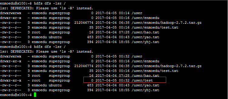 /** * 创建目录 */ @Test public void creatDir(){ String url="hdfs://s100:8020/user/test"; //configuration封装了HDFS客户端或者HDFS集群的配置信息, //该方法通过给定的URI方案和权限来确定要使用的文件系统 Configuration configuration=new Configuration(); try { //通过给定的URI方案和权限来确定要使用的文件系统 fs=FileSystem.get(URI.create(url), configuration); fs.mkdirs(new Path(url)); System.out.println("========================"); } catch (IOException e) { e.printStackTrace(); } }