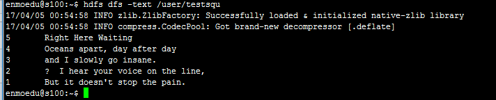 /** * 通过SequenceFile向方件中写入内容 */ @Test public void wirteSequenceFile(){ String [] text={"Right Here Waiting","Oceans apart, day after day","and I slowly go insane.", " I hear your voice on the line,","But it doesn't stop the pain. "}; String url="hdfs://s100:8020/user/testsqu"; Configuration configuration=new Configuration(); //Writer内部类用于文件的写操作,假设Key和Value都为Text类型 SequenceFile.Writer writer=null; try { fs=FileSystem.get(URI.create(url), configuration); //相当于java中的int IntWritable key=new IntWritable(); Text value=new Text(); writer=SequenceFile.createWriter(fs, configuration, new Path(url), key.getClass(), value.getClass()); for (int i = 0; i < text.length; i++) { key.set(text.length-i); value.set(text[i%text.length]); //通过writer向文档中写入记录 writer.append(key, value); } } catch (IOException e) { e.printStackTrace(); }finally { IOUtils.closeStream(writer); } }