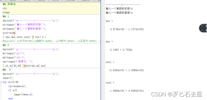 %fprintf('n对于%f+%fin指数为:%f%fi,n对数为:%f%fi,n正弦为:%f%fi,n余弦为:%f%fin',s1,s2,real(zhi),imag(zhi),real(dui),imag(dui),real(sin1),imag(sin1),real(cos1),imag(cos1));