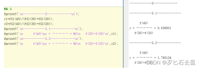 fprintf('n f(40)ny = ————— = %fn f(30)+f(20)n',y2);
