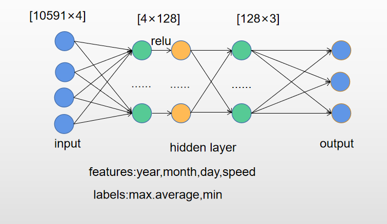接下来开始神经网络的搭建,这里使用一个包含两层隐藏层的线性回归模型,神经网络图如下:
