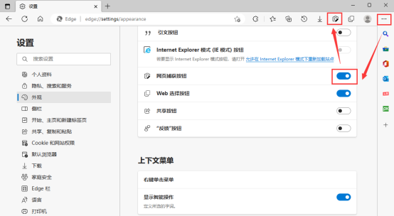 或者在【设置】中找到【自定义工具栏】,开启【网页截屏】,然后点击工具栏上的相机图标进行长截图。
