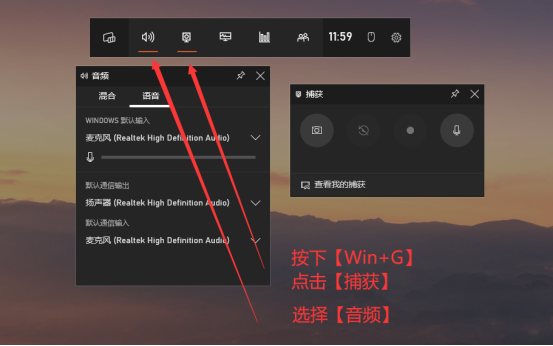 按【Win G】开启录屏工具,点击【截屏】录制屏幕内容。 如果您想录制自己的声音,可以选择【音频】-【语音】,然后打开【麦克风】。