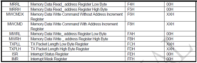(4)下图是DM9000中的寄存器对应基地址的偏移量,从中可以看出DM9000中的寄存器都是8bit的。