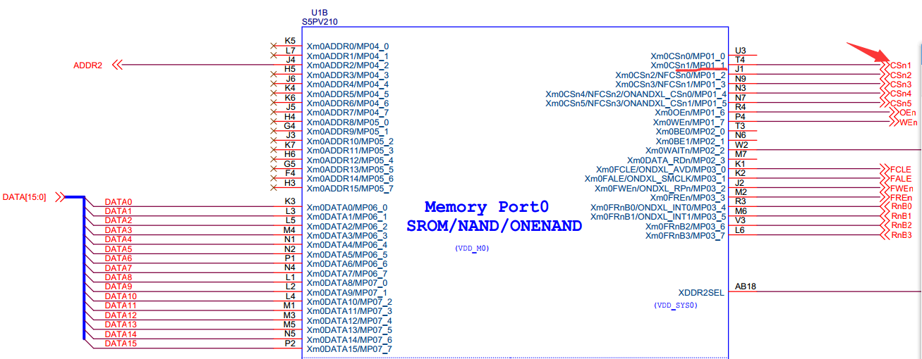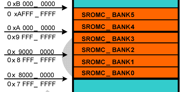 (3)如下所示,SROM控制器有6个bank。外部的SROM器件通过判断连接到自己的片选信号是否有效,来决定地址和数据是否可用。