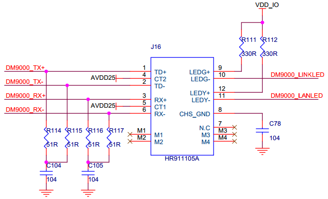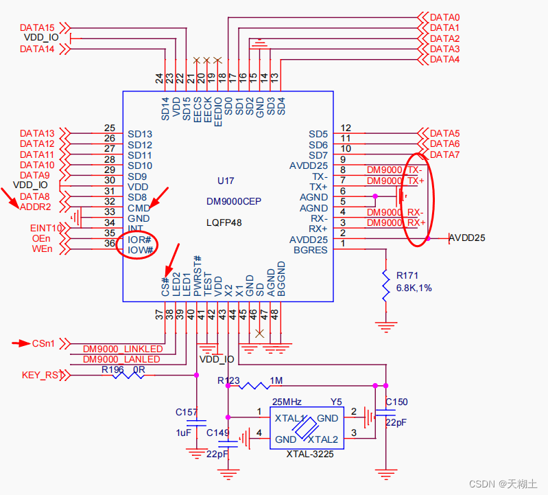 DM9000的CMD引脚连接了主机SoC的ADDR2引脚。DM9000为了减少芯片引脚数,数据线和地址线是复用的,也就是说,DATA0~DATA15这16根线有时候用作数据线来传输数据,有时候用作地址线传输地址。通过查询数据手册可知,这由CMD引脚的电平来决定:当CMD为高电平时,DATA0~DATA15这16根线传输的是数据;当CMD为低电平时,DATA0~DATA15这16根线传输的是offset。