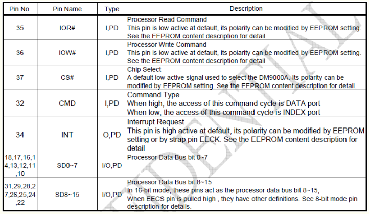 (3)地址引脚配合AEN引脚来选通该网卡芯片,对于大多数的应用来说没有意义,因为在我们的应用中一般只用一个网卡芯片,而这些地址引脚主要用于在多网卡芯片环境下选择其中之一。