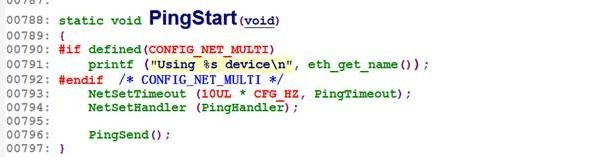 do_ping函数接着调用NetLoop函数(在netnet.c中),该函数前面的部分都是在构建ping的包,构建好后使用PingStart函数(在netnet.c中),准备发送ping包。