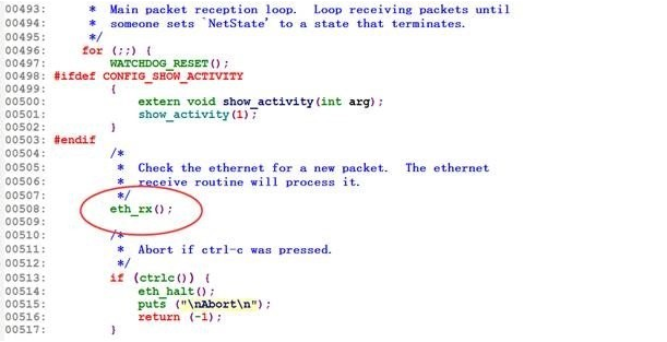 接收从网络回发的ARP包:在net_loop函数的后面,调用eth_rx函数(drivers/net/dm9000x.c中)接收网络数据包。此接收函数和具体网卡有关。