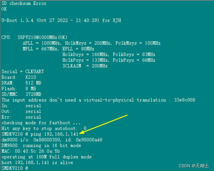 1)CONFIG_DM9000_BASE这个宏的值,是DM9000网卡通过SROM bank映射到SoC中地址空间中的地址。这个地址取决于网卡接到哪个bank。每个bank的基地址是SoC已经定义好而且不能更改的。X210开发板的网卡接到了bank1,而bank1的基地址是0x88000000,所以CONFIG_DM9000_BASE要修改成0x88000000。但实际上要改为0x88000300,否则网卡不能工作。0x300跟DM9000网卡芯片型号版本有关,是DM9000网卡本身的问题,其内部寄存器就有一个0x300的一个偏移量。