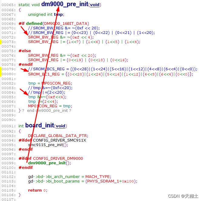 这个dm9000_pre_init函数在/board/samsung/smdkc110/smdkc11.c文件中,内容如上图,被注释掉的是三星版本uboot中的代码,新添的是针对X210开发板的代码。DM9000网卡使用的是bank1,因此新添的代码是对SROM控制器的bank1进行初始化。