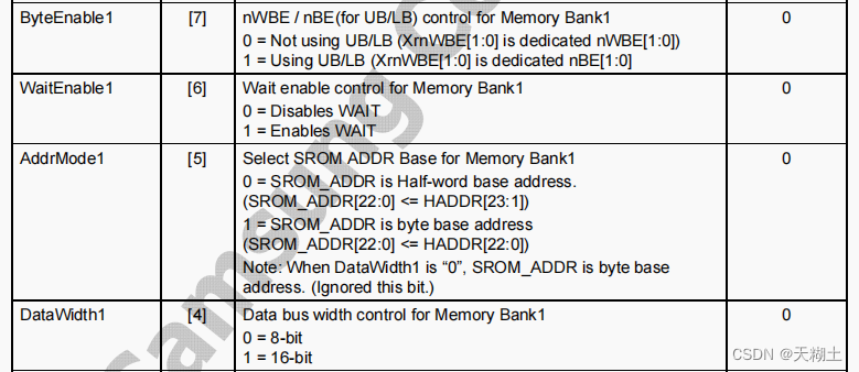 SROM_BW寄存器每4个位控制一个bank,bank1对应着SROM_BW寄存器的第7~4位。
