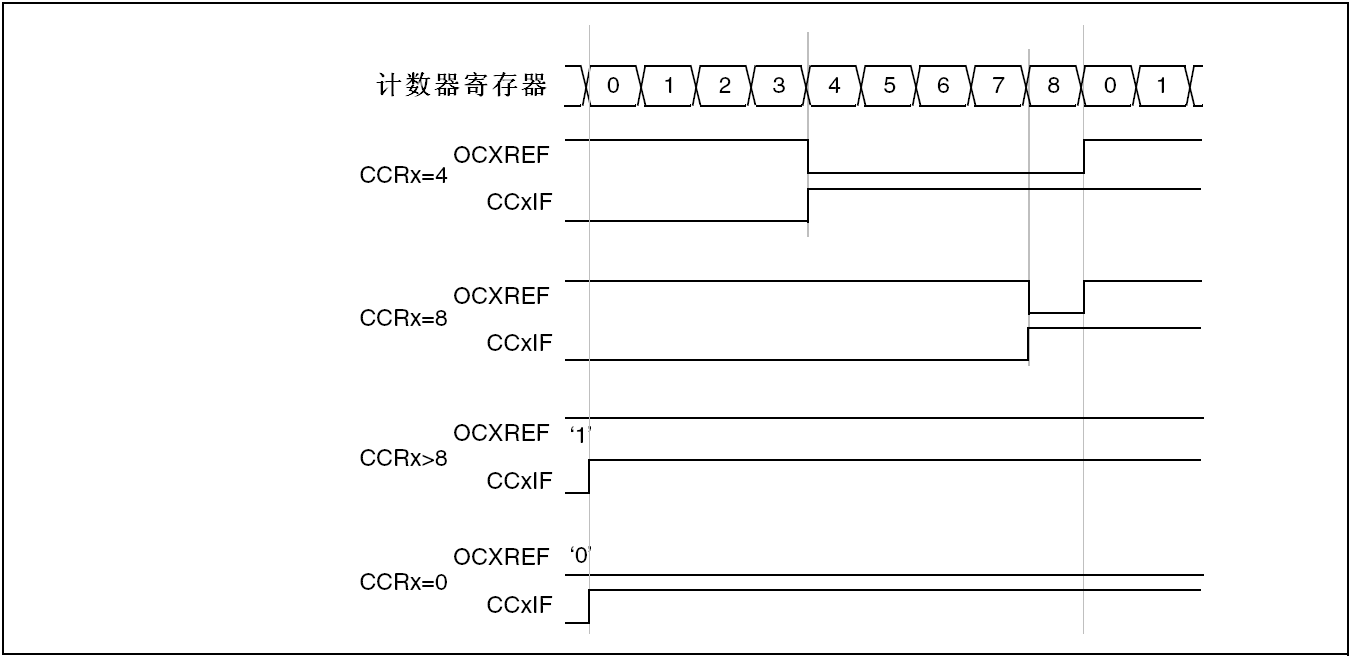 下面是一个PWM模式1的例子。当TIMx_CNT<TIMx_CCRx时PWM信号参考OCxREF为高,否则为低。如果TIMx_CCRx中的比较值大于自动重装载值(TIMx_ARR),则OCxREF保持为’1’。如果比较值为0,则OCxREF保持为’0’。 下图为TIMx_ARR=8时边沿对齐的PWM波形实例。