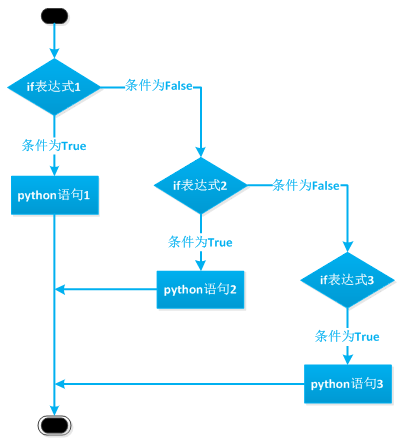 使用 if…elif…else语句时,表达式可以是一个单纯的布尔值或变量,也可以是比较表达式或逻辑表达式,如果表达式为真,执行语句;而如果表达式为假,则跳过该语句,进行下一个elif的判断,只有在所有表达式都为假的情况下,才会执行else中的语句。