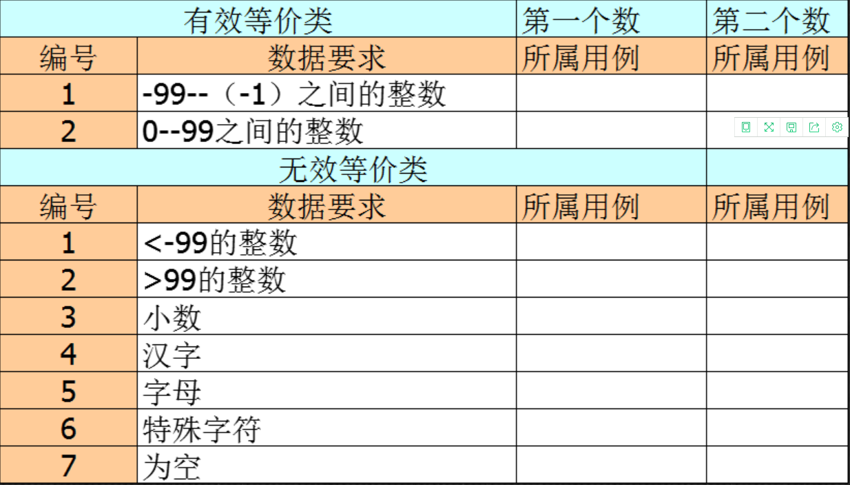 1) 有效等价类:-99—99之间的整数。整数的存储在计算机底层中会使用不同的算法:正整数和负整数算法不同,所以测试时正整数和负整数应该分开来测。(一般对有效等价类数据应用,无效等价类数据一般不需要正、负 分别测)