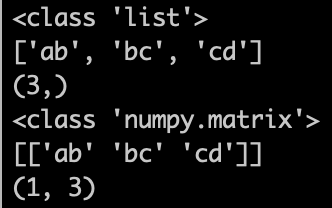 输出结果如下, list转换为matrix后,shape由(3,)变为(1,3),并无报错。