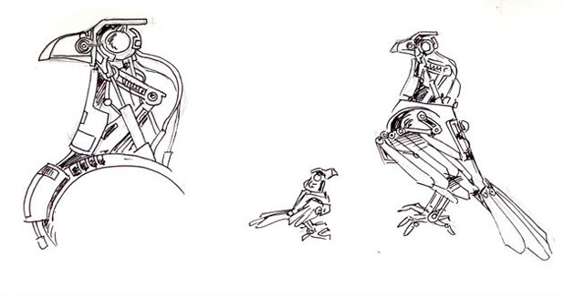 下面要做的是创建翅膀,让鸟看起来有一种能运作的效果(图10)。这里是通过扩展立方体的表面来制作的,然后我添加了一些额外的机械化元素进行支撑,比如一些节点。身体剩下的部分是用创建头部同样的方法来制作的,我还把所有的小机械部件与最大的部件结合在一起(图11)。贴图部分不是很复杂,因为我用的是程式化的纹理。